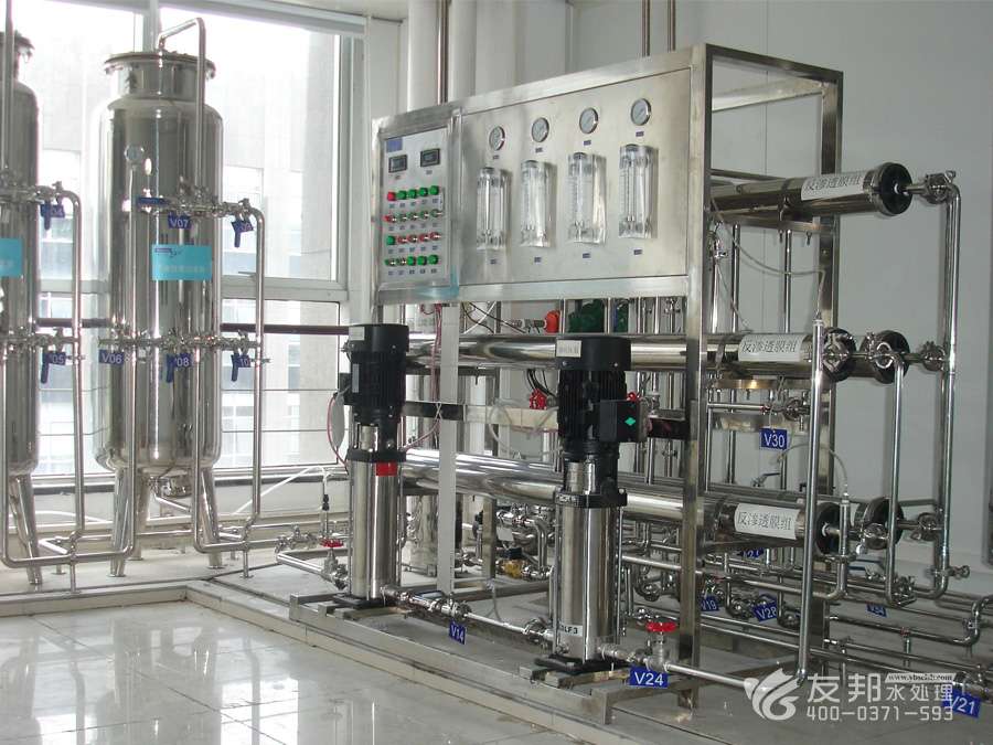 2、預(yù)處理→一級(jí)反滲透→加藥機(jī)(PH調(diào)節(jié))→中間水箱→第二級(jí)反滲透(正電荷反滲膜)→純水箱→純水泵→EDI裝置→紫外線殺菌器→0.2或0.5μm精密過濾器→用水對(duì)象(≥17MΩ.CM)